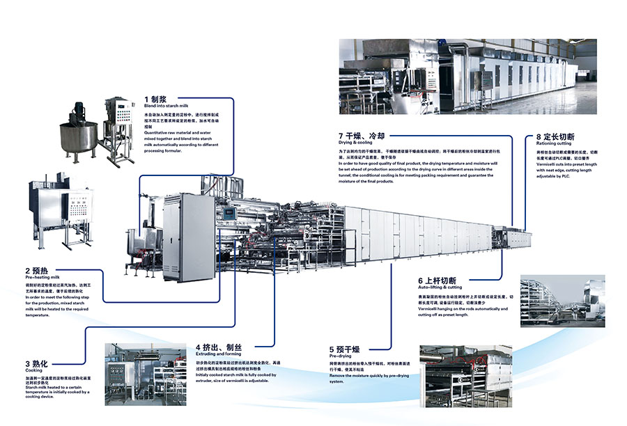 2、本生產(chǎn)線無需要水洗環(huán)節(jié),因此大大地節(jié)省水資源,且無須建立污水處理廠, 解決了粉絲生產(chǎn)中的環(huán)保問題;