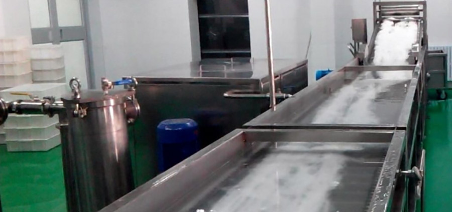 馬鈴薯淀粉→篩分清理→貯料緩沖→提升 → 和面→緩沖喂面→擠條→擠絲→ 水煮 → 水冷卻→切斷